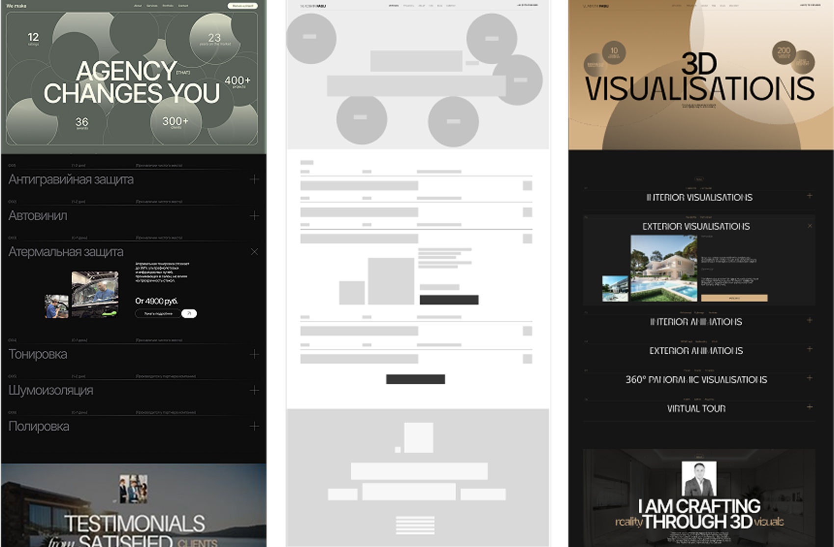 I reviewed portfolio sites from leading 3d visualisation studios and collected section layout references from pinterest and behance. Most of them used large imagery, minimal layouts and clear structure to build trust quickly. This highlighted how far the existing site lagged behind and set a benchmark for clarity, hierarchy and visual impact.