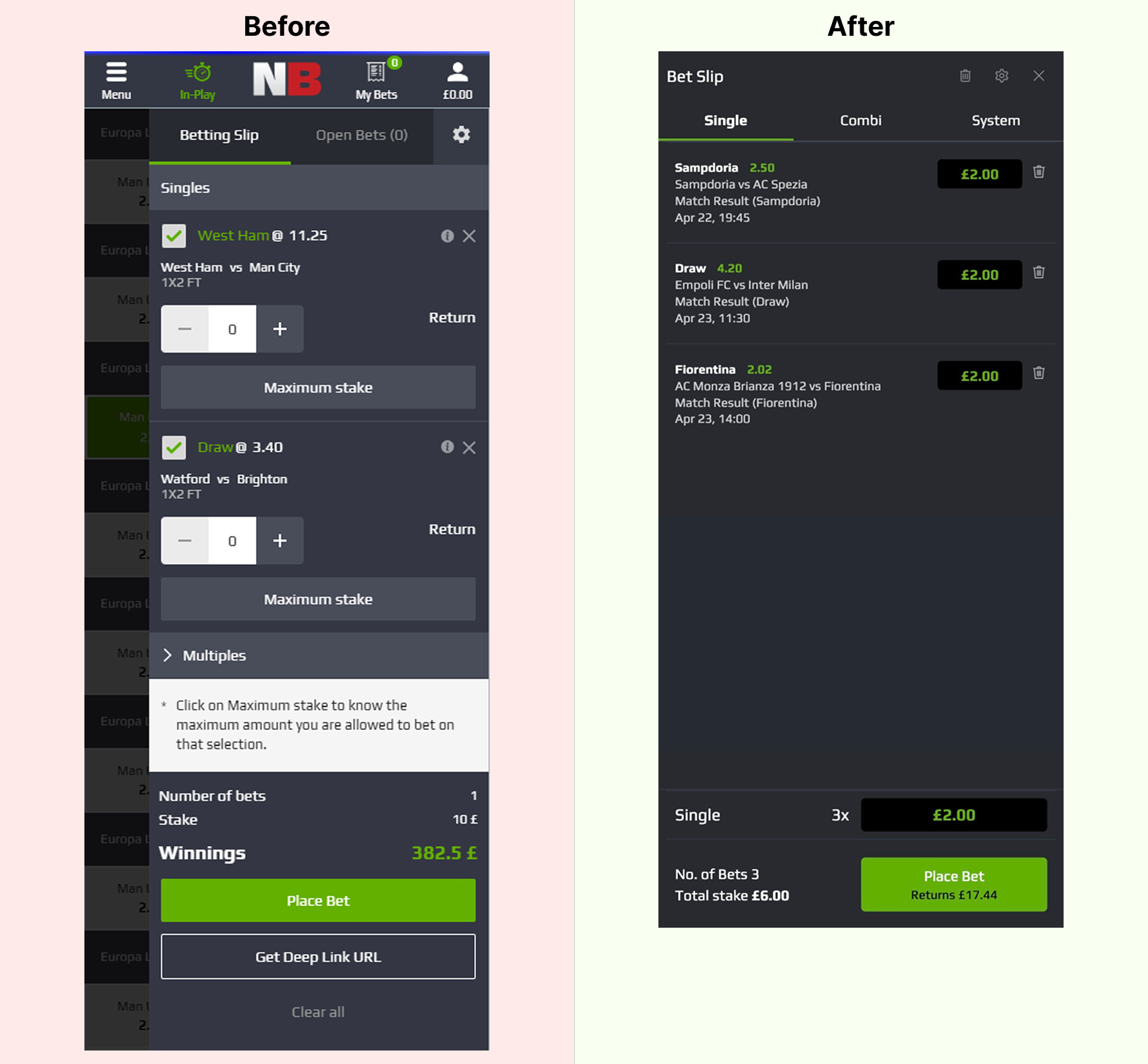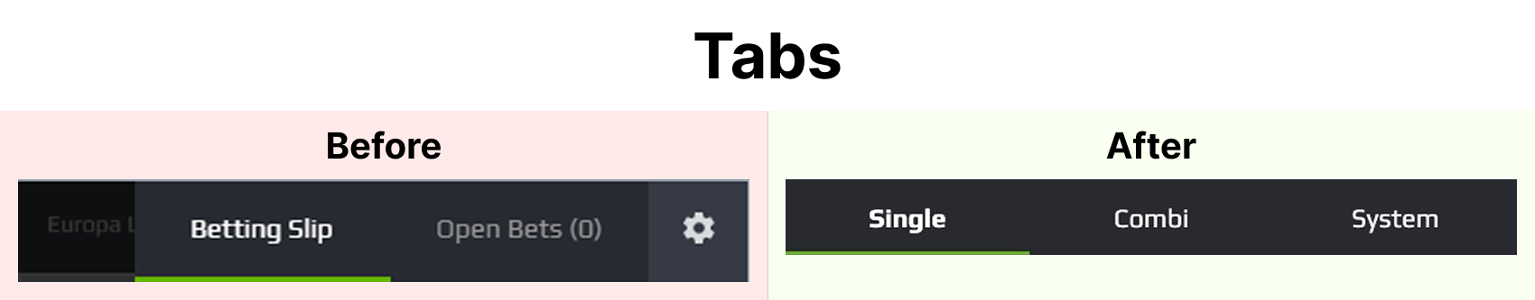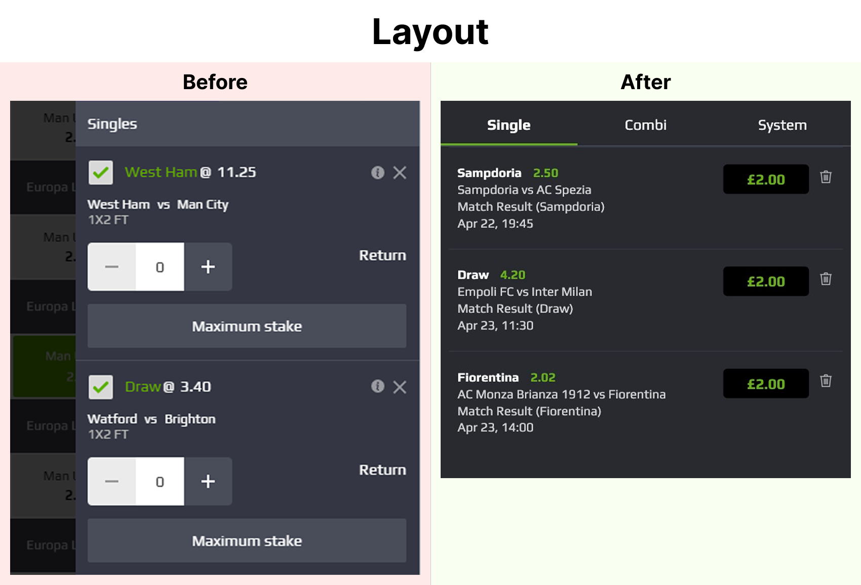 All three bet types were grouped together in one area, which made it hard to see which mode was active. I removed the extra buttons and introduced clear tabs for single, combi and system. This improved alignment and spacing and made switching between bet types obvious.