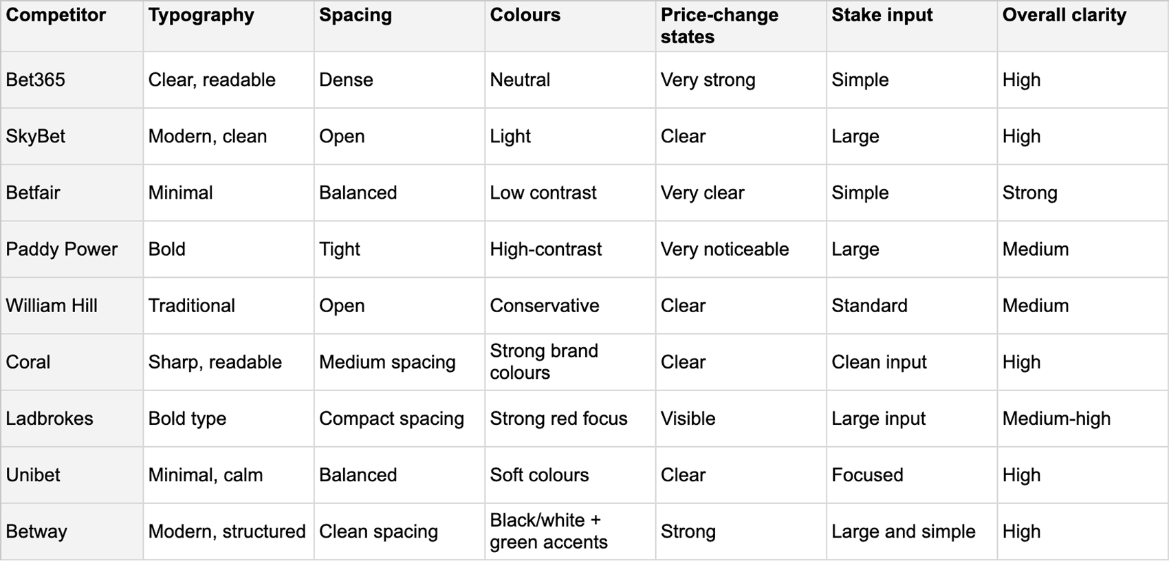 I reviewed the old betslip across mobile and desktop. I compared it against common betting UI patterns and the behaviour of major competitors. I also looked at feedback from product, QA and customer support and checked it against existing requirements and flows defined by the product team. This helped me understand where users struggled and where the structure caused confusion.