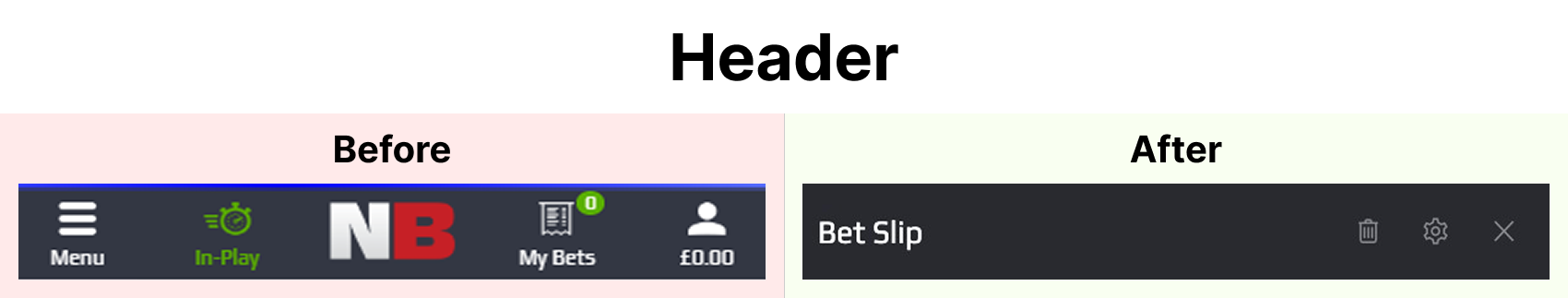 The original header had icons, labels and actions competing for attention. This made the top of the betslip feel heavy and unfocused. I reduced it to a clear title and essential actions to give users a simple starting point.
