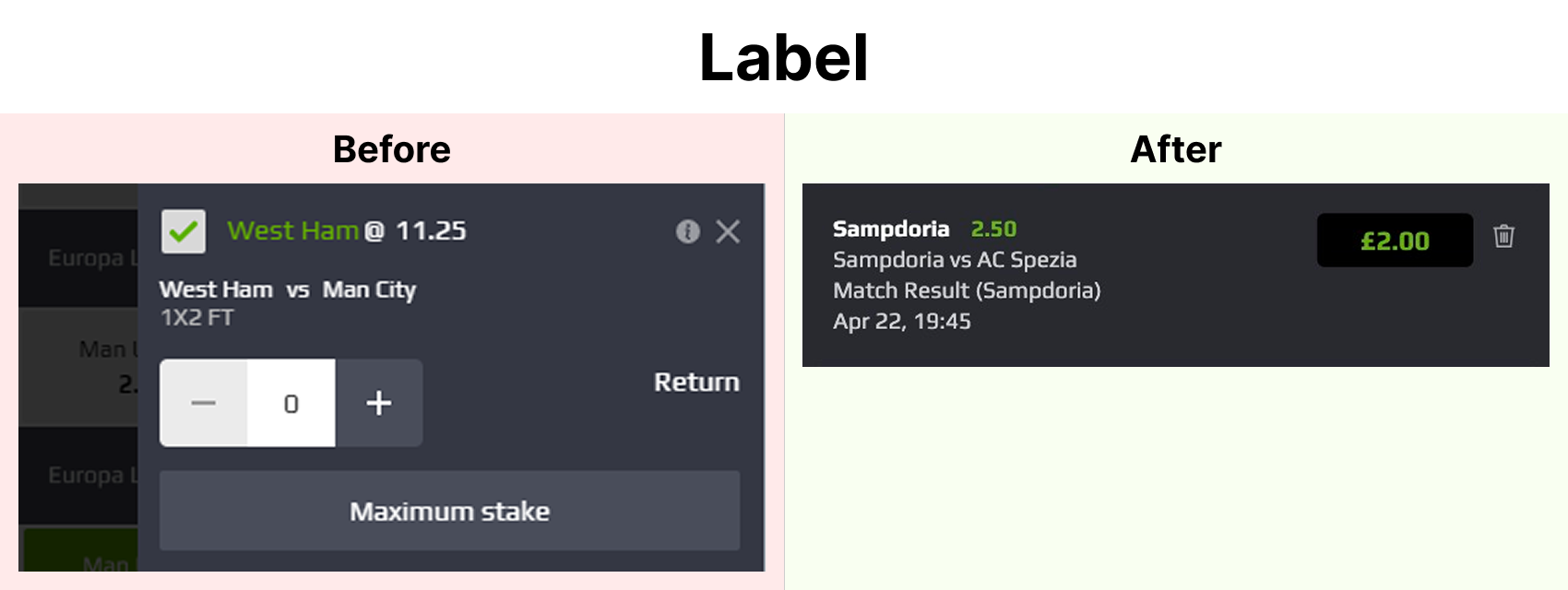 The old bet item mixed important information (selection, odds, event details and stake) with equal weight. This slowed down scanning and stake entry. I separated the information into clearer layers and improved the contrast between odds and stake to support quick interaction.