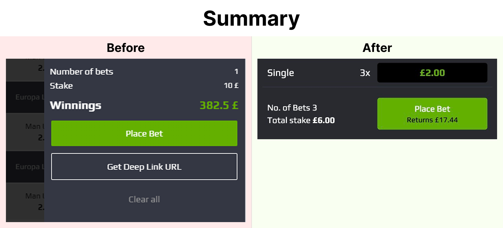 Totals, stake and the call-to-action lacked hierarchy and felt disconnected. Users had to work harder to confirm their bet. I grouped totals together, lifted the CTA visually and clarified the return value so the final step feels more confident and predictable.