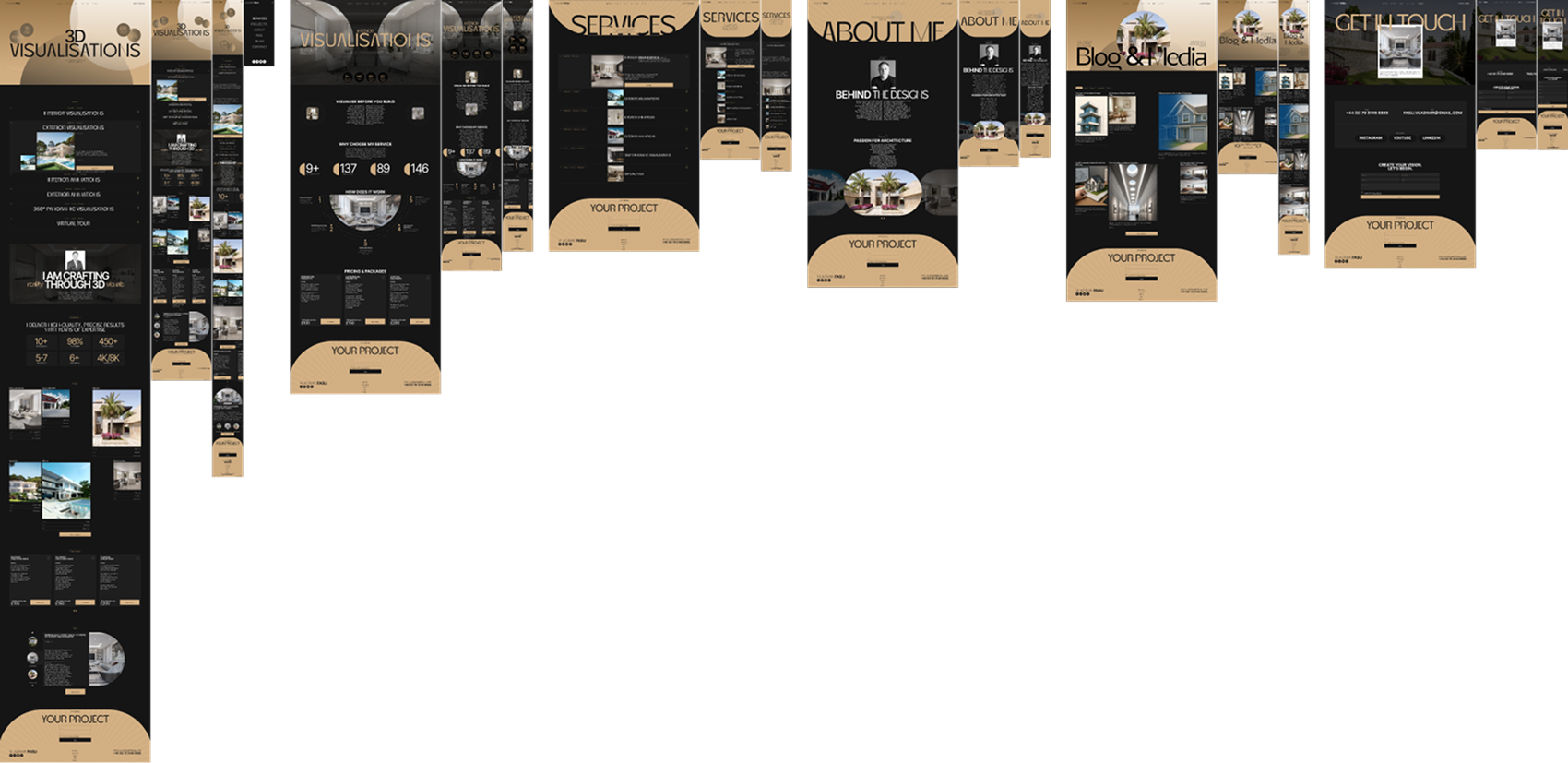 I reviewed portfolio sites from leading 3d visualisation studios and collected section layout references from pinterest and behance. Most of them used large imagery, minimal layouts and clear structure to build trust quickly. This highlighted how far the existing site lagged behind and set a benchmark for clarity, hierarchy and visual impact.